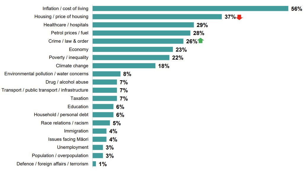The latest edition, published four weeks ago, saw law and order leap up to second on the list, with 40% of respondents naming it as one of their three main issues of concern. The cost of living remained top, however, on 63%.