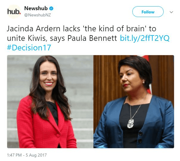 The headline was hyperbolic and unfair. It has since been changed to “Jacinda Ardern lacks substance compared to Bill English – Paula Bennett”. (What Bennett in fact said in the interview, recorded Friday, was: “I just think what [voters] are also looking for is substance and someone who’s got the kind of brain to pull this country together and has got a proven record”, prompting Lisa Owen to interject, “Doesn’t she have substance?” and Bennett reply: “I just think he’s got a bit more is all. I think she does, but I think that he equally has a proven track record …”) But it is an instructive episode. Any shade cast on Ardern that looks imperious or patronising, anything that looks even distantly like bully tactics, will make headlines.