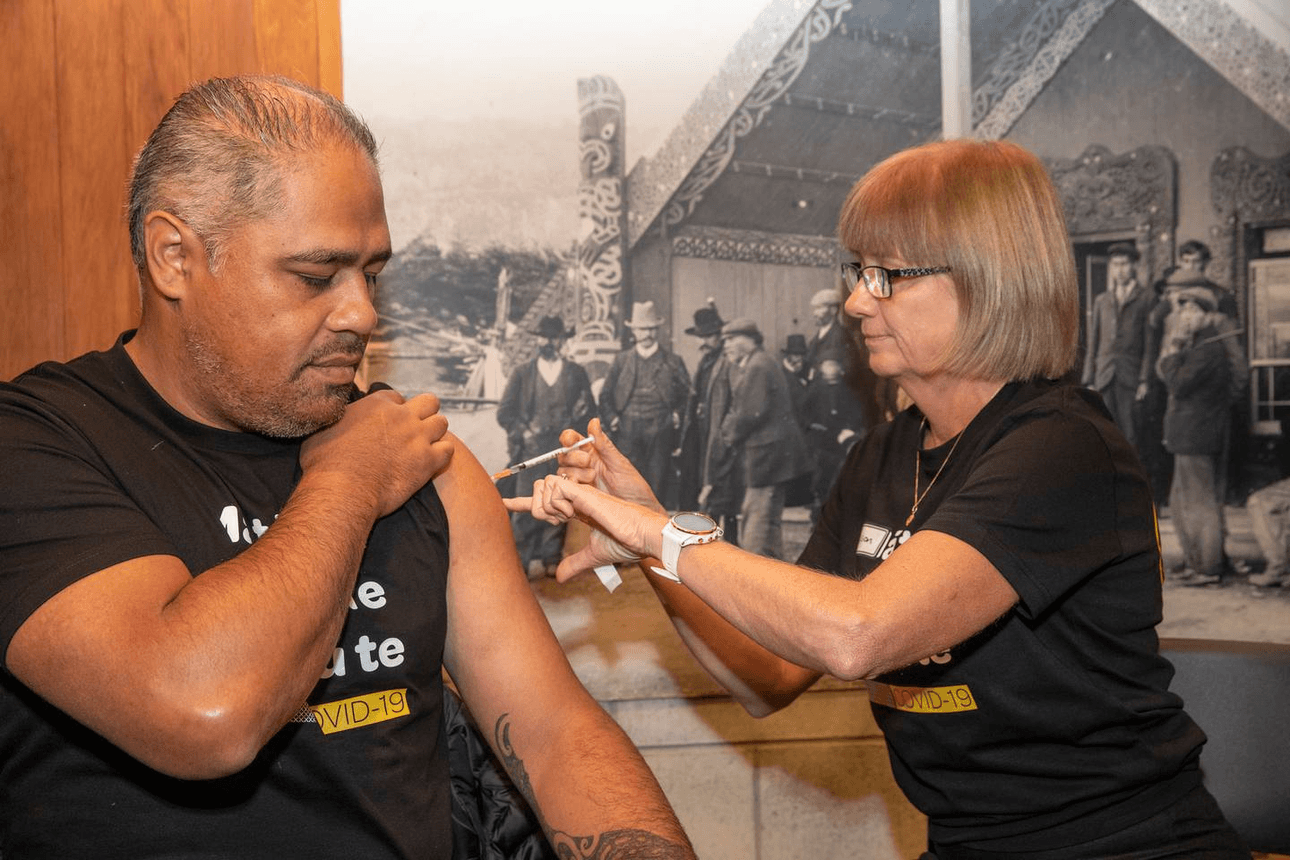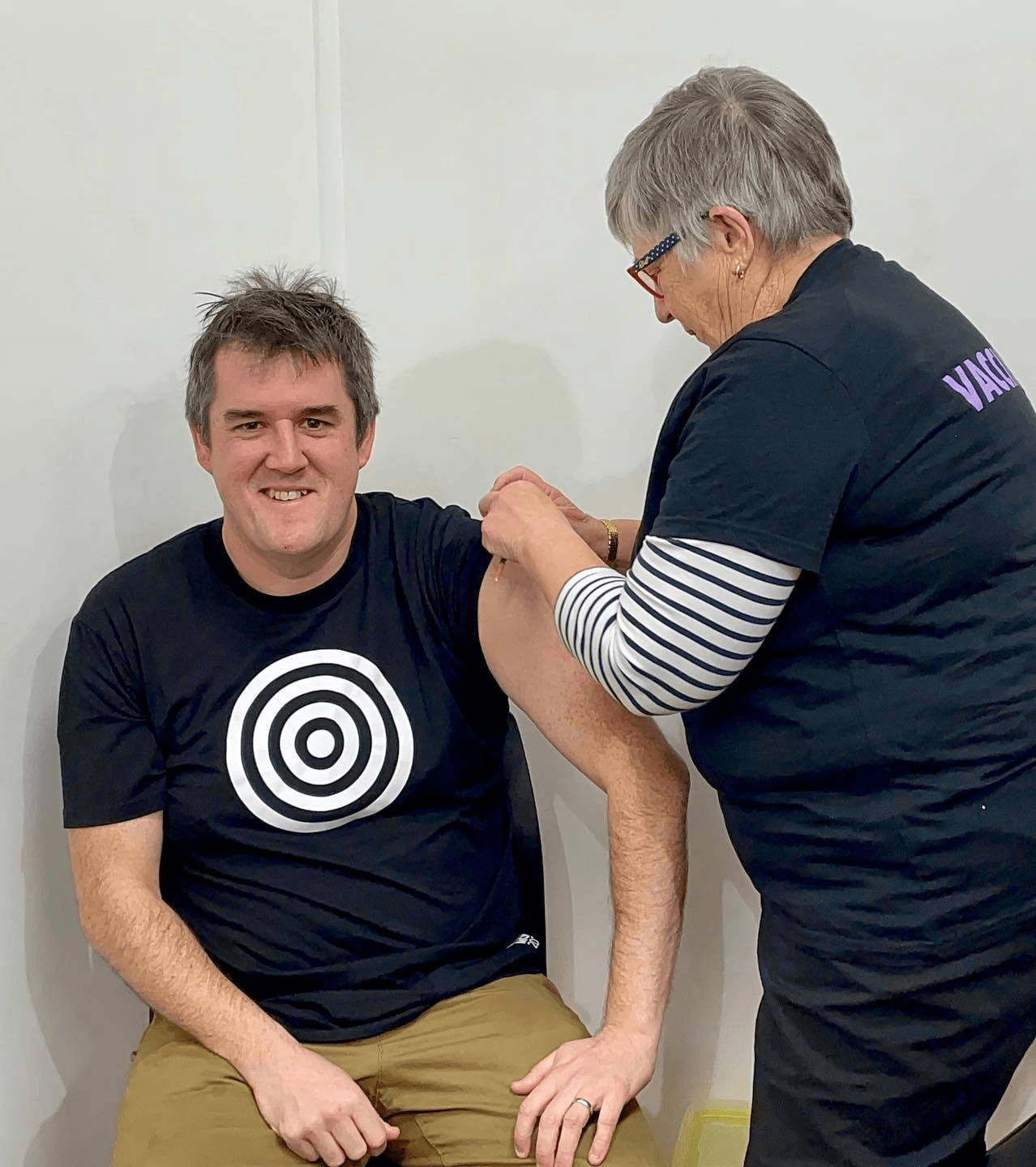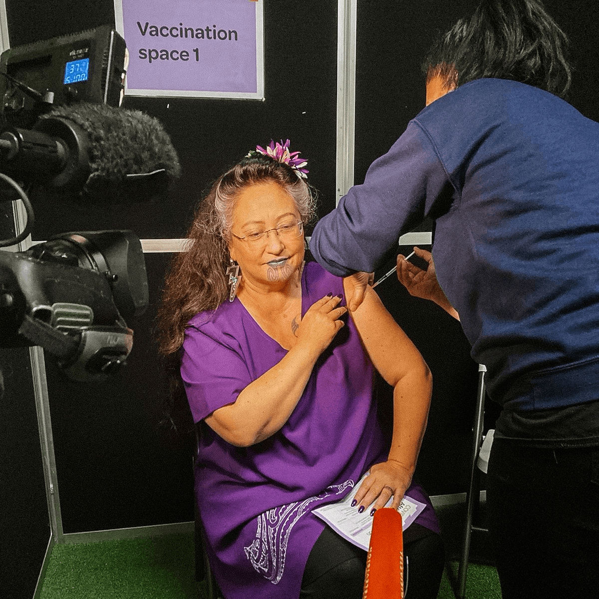 We’re dealing with a pro here. Unflinching on impact. Brings a cinematic “behind the scenes” vibe by leaving the camera in shot. One wonders if Kerekere’s commitment to purple branding so strong that she demanded vaccination space 1 and its purple sign. 9/10