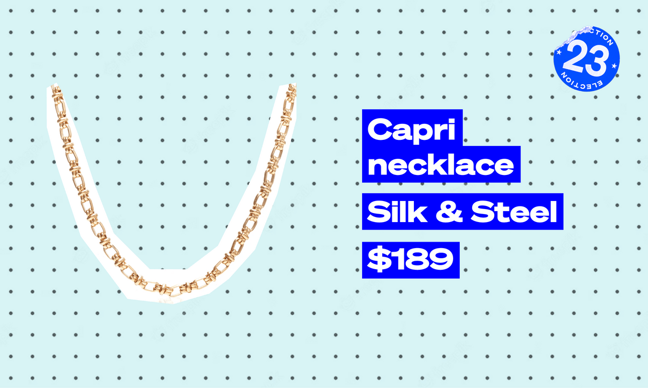 This is no ordinary chain. The capri necklace (no known relation to the pants) is made out of stainless steel so it’s basically indestructible, the links will not squash or squeeze. It is even officially approved for men to wear, maybe because they also have necks. Eventually the 14k gold plating may wear off, but at $189 its considerably cheaper than a necklace that’s gold all the way through. It’s from New Zealand brand Silk and Steel, which has also been worn by Rachel Hunter (hot). Capri is for the “jet-setter”, so it will serve Willis well on the campaign trail, and you on any holiday where you want to look rich and sophisticated. Would pair well with a white bikini and bubbles at 10am.