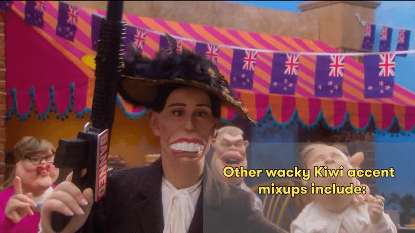 If you’re an international reader of our site and are curious about New Zealand and want to know more I’ve annotated the Spitting Image sketch with all the New Zealand references and Easter eggs I could find. After watching this video you’ll be armed with an arsenal of fascinating Kiwi facts ready to share with friends and family alike. I’ve also screenshotted the key information below.