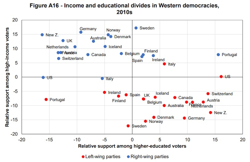 New Zealand is interesting. Almost the highest income polarisation in the 1970s series but barely any difference in educational polarisation. If you were rich (top 10% of earners) you probably voted National, if you were in the lower 90% of the income distribution you were more likely to vote Labour. Your educational status didn’t really matter. Now here’s the 2010s: