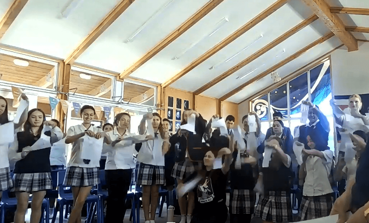 Merita Levave, a teacher at Newlands College, gave her five-minute presentation with a classroom of students in the background. As she wrapped up her speech, the students all stood up, ripped pieces of paper representing the bill, and shouted “Toitu te Tiriti”.