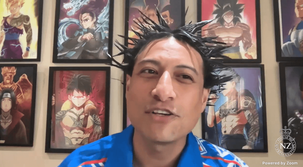 Riki Welsh spoke on behalf of Pacific Youth Leadership and Transformation. “Our community feels that Pasifika people should not be neutral, we should be in support of Māori,” he said. He stood out for his spiky hair, background of anime characters, and for beginning his speech with “whoop whoop!”.