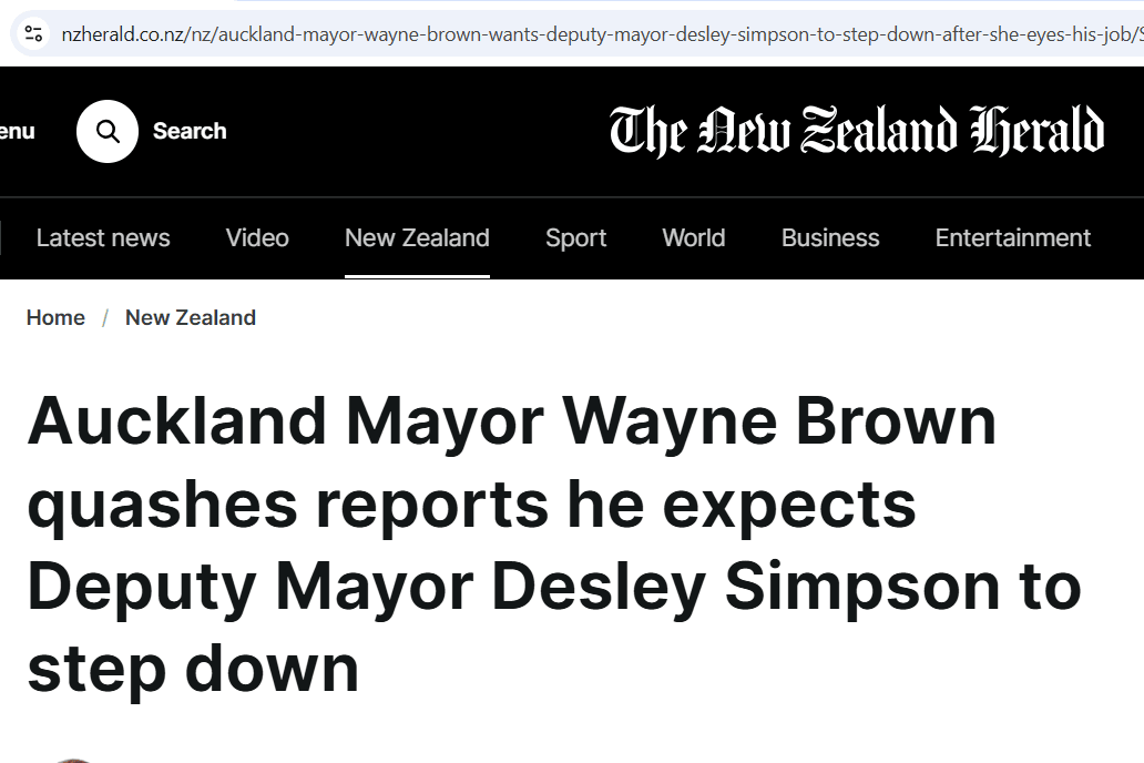 Every blockbuster* needs a good teaser promo, and that was delivered this week in the form of an afternoon comedy that began with the New Zealand Herald headline, “Wayne Brown wants deputy mayor Desley Simpson to step down after she eyes his job”, and ended a couple of hours later when the very same Herald report on the very same URL was updated with a new headline, “Wayne Brown quashes reports he expects Desley Simpson to step down”.