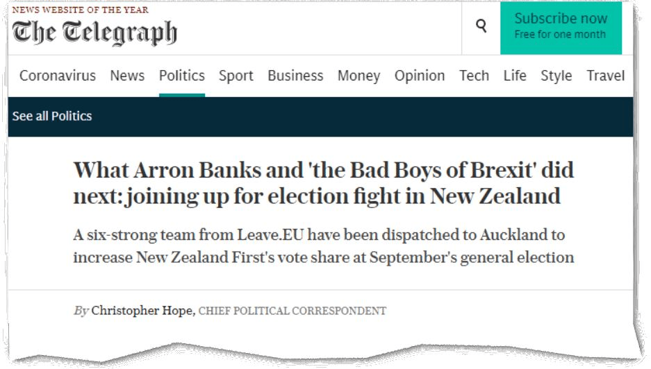 The Daily Telegraph, newspaper of choice for the British Conservative establishment, reported overnight that the New Zealand First Party had hired a crew of political operators from one of the most aggressive and controversial groups in the Brexit campaign to create “mischief, mayhem and guerrilla warfare” in the leadup to the September election.
