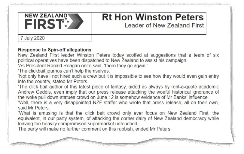 Peters, who is New Zealand’s deputy prime minister, then chose to respond. In a statement he snubbed the venerable British broadsheet the Daily Telegraph (established 1855), however, choosing instead to focus on the New Zealand site The Spinoff (established 2014) in a statement issued this afternoon.
