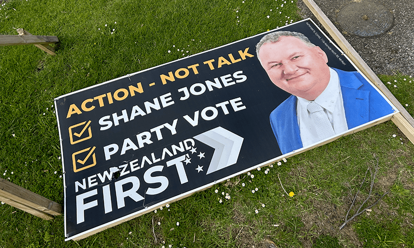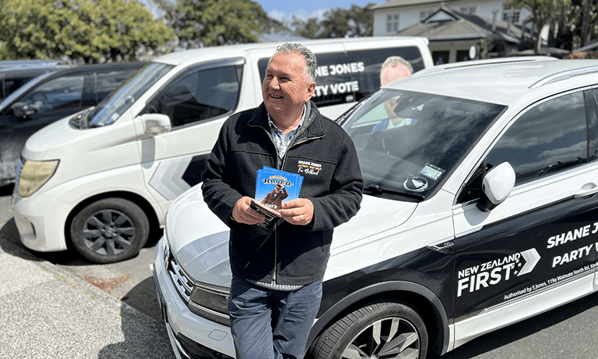 It’s a sunny day in the Bay of Islands, but windy too, and Shane Jones is dealing with that perennial of campaigning: toppled corflute signs. One at the end of Matauwhi Bay, another on the hill edge of Russell. Jones is door-knocking in town, and chatting with Karl, the proprietor of the town’s branch of Hammer Hardware, who asks if the breeze brought them down. Jones shakes his head dolefully, and there are clues that it’s not natural causes. “I want to know who’s drawn an oversized cock on my mouth,” he says. The accompanying text reads “party at Shane’s”. He smiles and laments the lack of permanent police presence in the town.