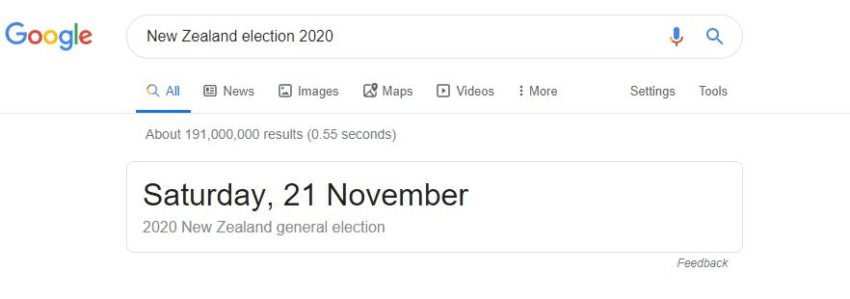 Sorry, popular search engine Google, but you’re wrong. It’s possible of course you can see into the future, but more likely you just crawled the text in the Wikipedia entry on the NZ election 2020 – “The last possible date for the next general election to be held is 21 November 2020” – and trimmed it down to an easy burst of (wrong) preview info.