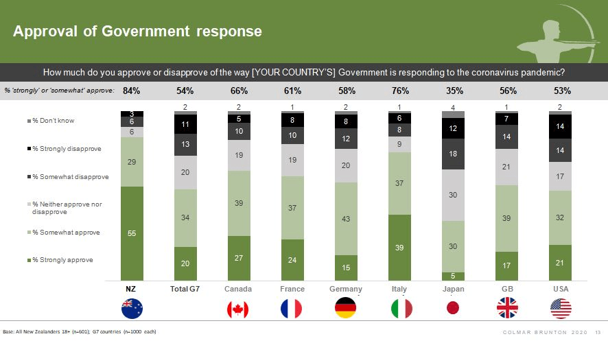 The poll found that 84% of New Zealanders approve of the government handling of the outbreak, compared with 54% across the G7.