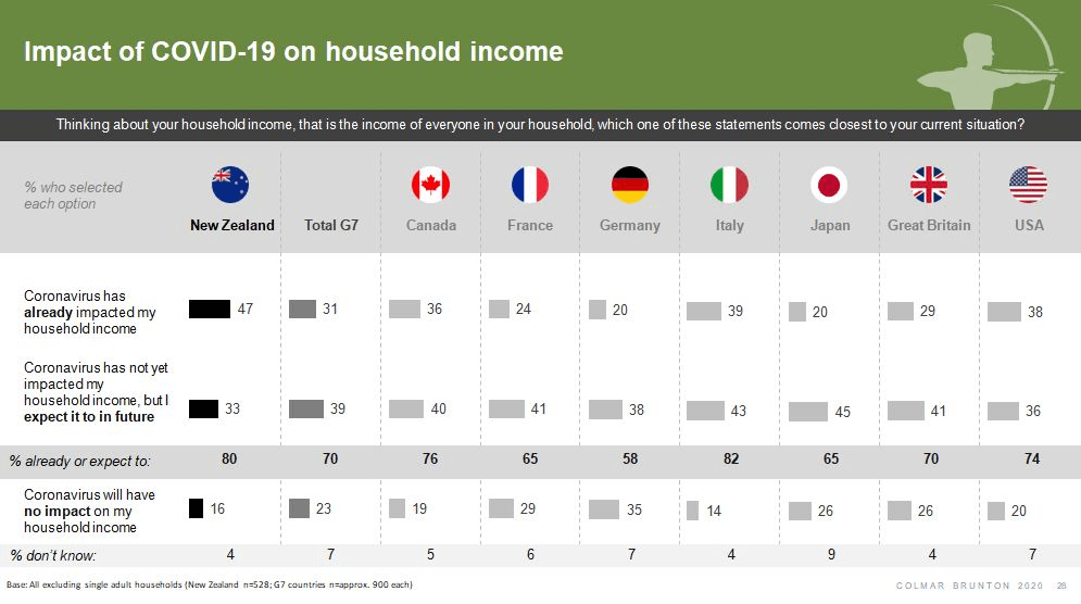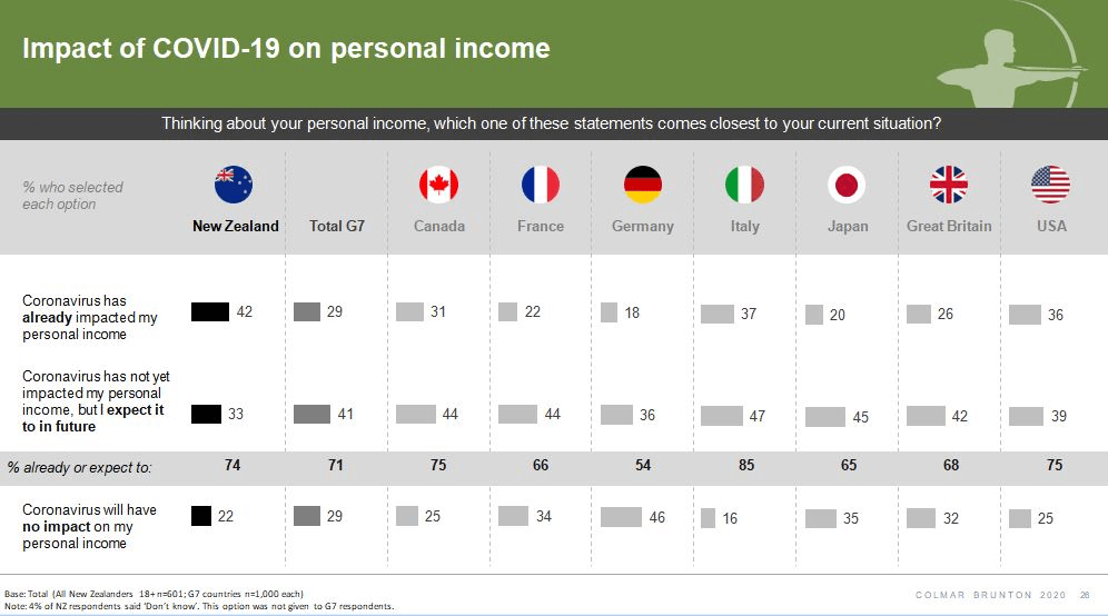 However, 42% of New Zealanders say Covid-19 has impacted their personal income, compared with 29% across the G7 nations.