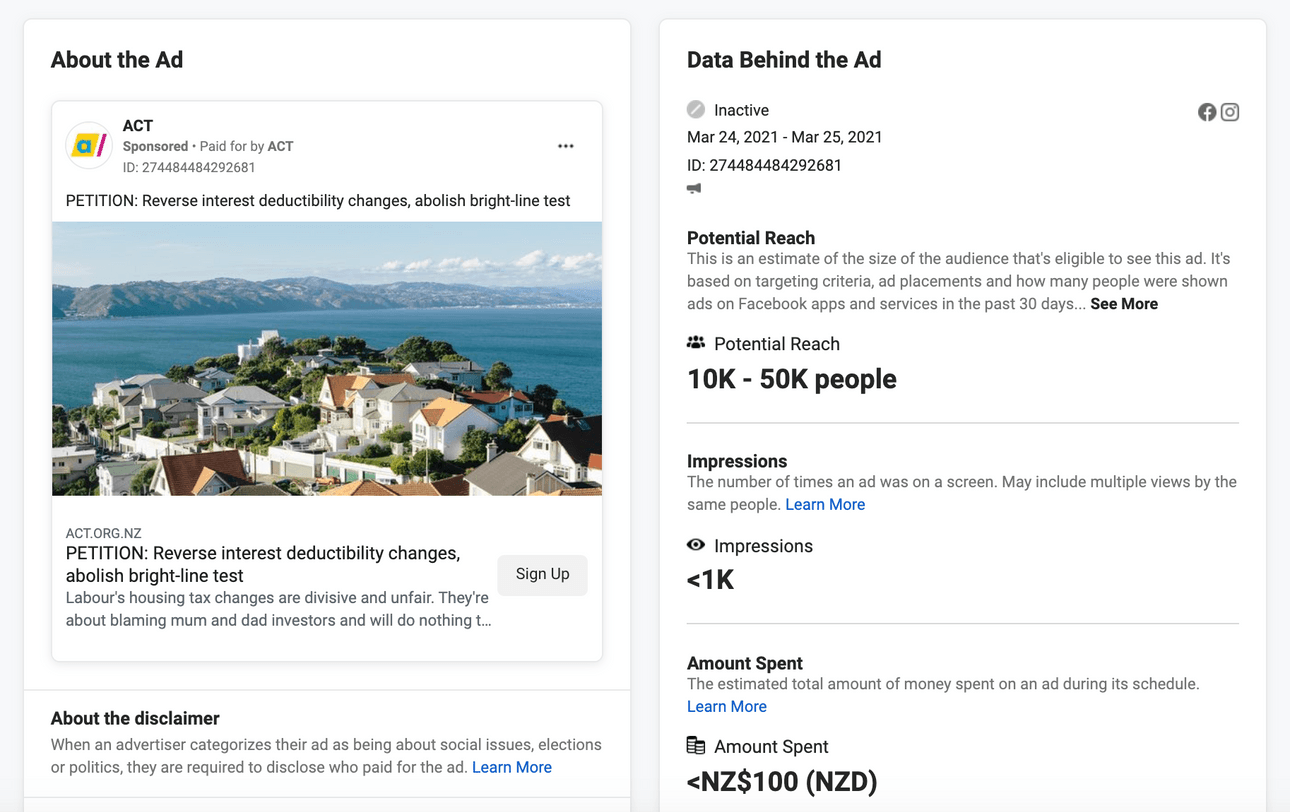 Data compiled by Aro Digital showed the Greens spent about $400 on Facebook ads for their conversion therapy petition, while about $800 was spent on ads promoting a recent open letter on “beautiful, healthy oceans”, which also called for signatures. National does not appear to have spent money on promoting its trans-Tasman bubble petition on Facebook, while Act’s housing law repeal spend was less than $100.