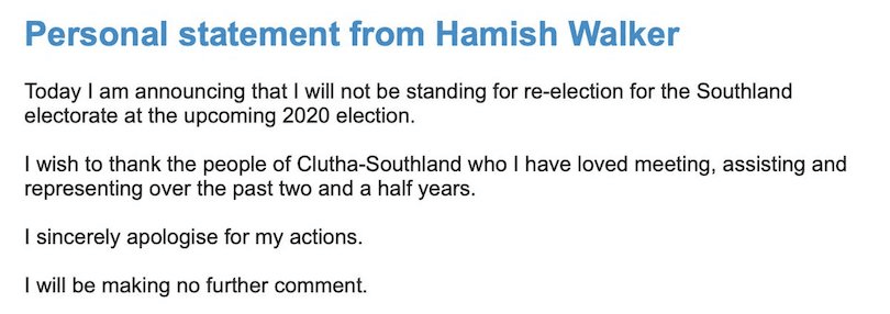 National MP Hamish Walker, who leaked confidential Covid-19 patient details to media, has released a statement saying he will not be seeking re-election come September.