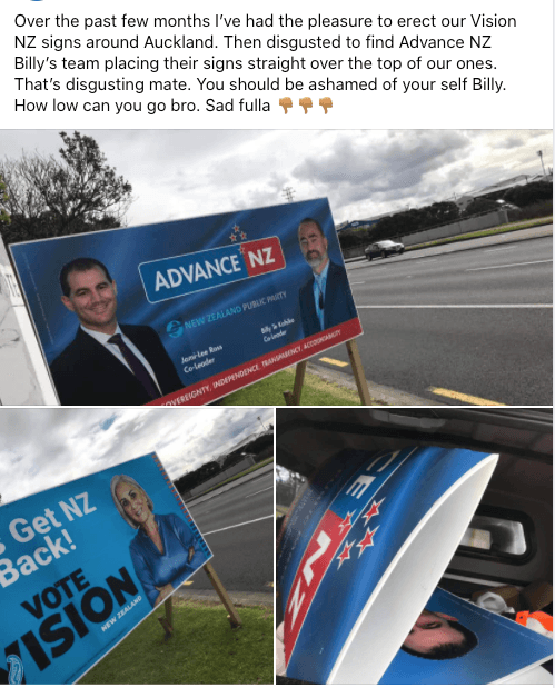 Photos posted to Facebook by a Vision NZ supporter claim to show the party’s signage covered over by an Advance NZ hoarding, displaying the smiling faces of Jami-Lee Ross and Billy Te Kahika.