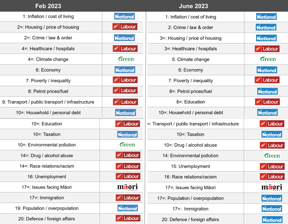 Of the top five issues, National is preferred for three. In February, Labour could boast that they were judged better placed to deal with 11 of the 20 most important issues, compared with six for National. No longer. That same comparison gives National 10 of 20, with Labour seven.