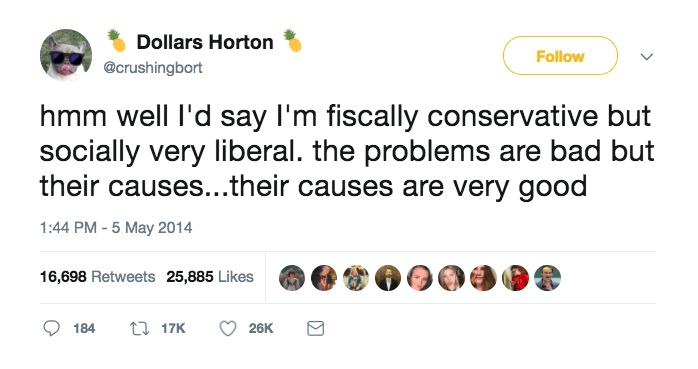This frustrating inability to pin down his ideology, political philosophy or system of values is becoming Morgan’s achilles heel. “If I had to pick a party I was closest to in terms of social justice and the environment, absolutely, it’s the Greens,” he said. “But if I had to pick a party I was closest to in matters of economics, it would be the Nats.” In other words, he is the embodiment of a much-cited and beloved @crushingbort tweet from 2014: