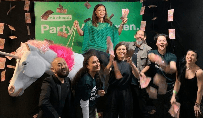 In an ad that may very well be a 10-dimensional chess move by the social media expert gurus of the “Bad Boys of Brexit”, NZ First collaged the Green co-leaders alongside a unicorn and raining cash.
