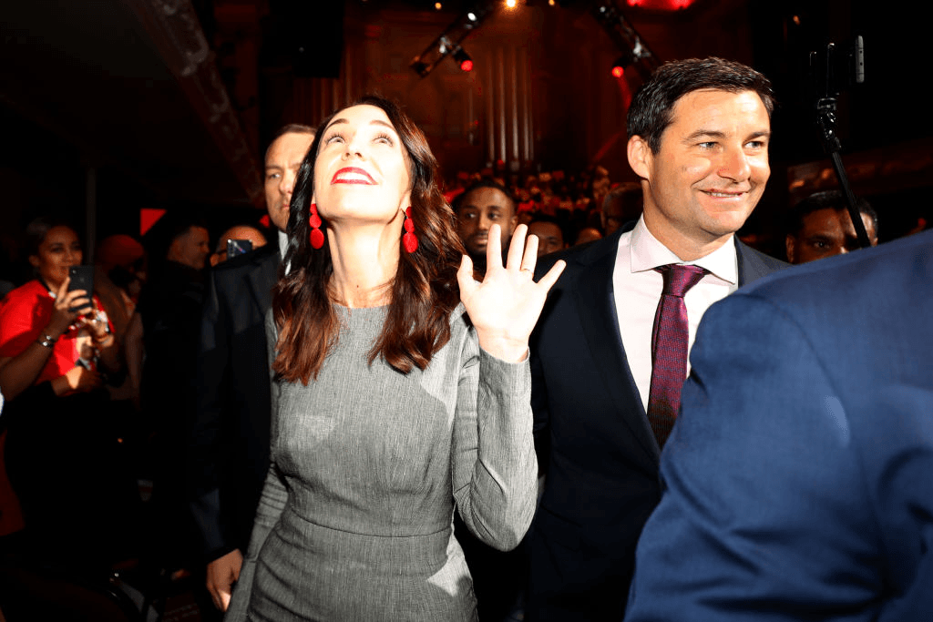 It was slicker, too – from the opening multi-media poetry performance that led into the mantra “let’s keep moving” to the well-drilled chants from the choral stalls on stage. Outside in Aotea Square a giant Jacinda Ardern beamed down from the Mid City wall. Inside, there were chevrons everywhere – diligently keeping moving across the screens in black and red and white. Even the lighting rig hovered over the stage like a chevron nod to a wharenui.