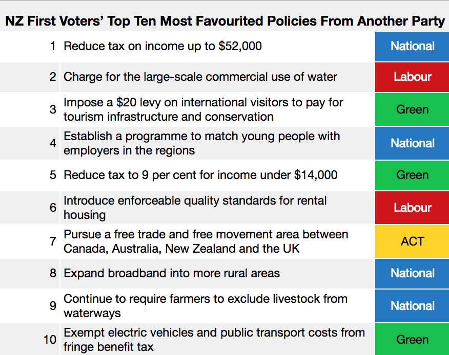 As for Labour and National voters’ unique NZ First favourites, Labour voters’ were mainly education related, whereas the National voters preferred some of New Zealand First’s tax policies. Labour voters liked writing off student loans for time spent in New Zealand and introducing a universal student allowance, for instance, while National voters liked NZ First’s policy of providing tax incentives for R&D.