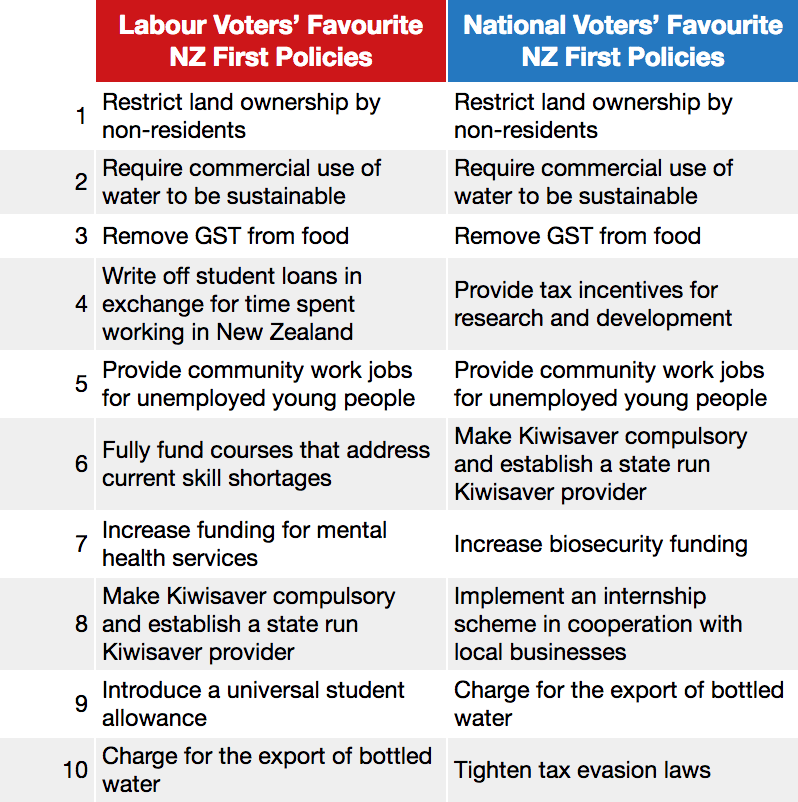 What’s most surprising are the commonalities. As the list below shows, six of the top ten NZ First policies among Labour and National voters were the same. Each of these is a real prospect regardless of which way Winston goes.