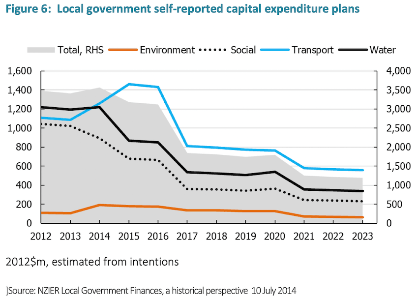 The end result was an increasing fiscal dominance by the crown at the expense of local government, and a weakening of councils’ ability to invest in infrastructure, as this 2014 chart shows. Perhaps not surprisingly, voters could see where the real power and consequence lay: at the central government level, rather than with councils. That growing imbalance in fiscal power has coincided with the relative decline of council voting rates and the infrastructure investment drought relative to population growth.