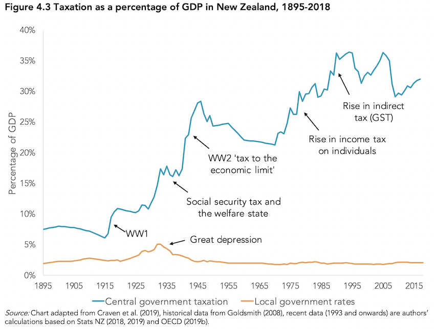 This shows Aotearoa’s decline in tax-GDP ratio since the mid-1980s and the even greater decline in rates relative to GDP.