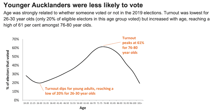 Last year’s General Social Survey (civic and cultural participation) found 71.3% of owner-occupiers said they voted in the last local elections and 47% of non-owner occupiers said they voted. Council voting rates for those aged over 55 ranged from 71% to 86%, while voting rates for those aged under 44 ranged from 43% to 61%.