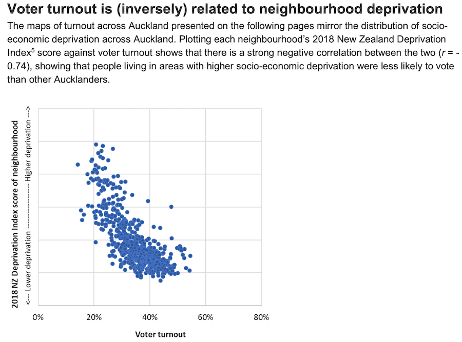 Previous analysis of local turnout rates in Auckland from the 2016 election found a close connection between deprivation scores, home ownership rates and voting rates. Those in the richest neighbourhoods with the highest percentage of home owners voted the most, while those in the poorest with the lowest home ownership rates voted at the lowest rates.