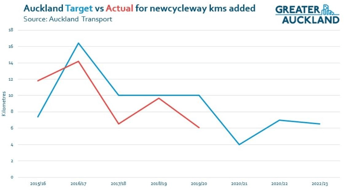 AT has consistently set itself low targets for building new cycleways, and then failed to hit them. Last year it promised 10km of new cycleways and built 6km. Even that 10km target was down from 15km in 2015/16. Its target for this year is just 4km. Auckland has more than 7000km of urban roads.
