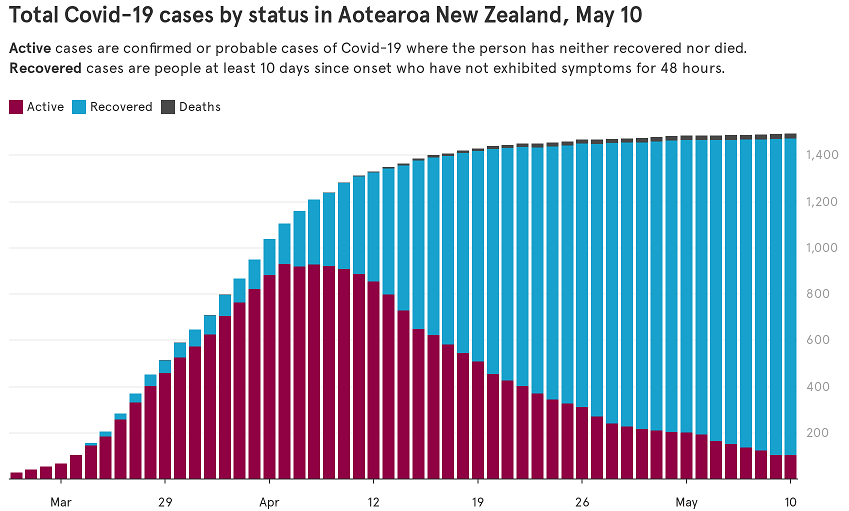 But given all of that, the earliest plausible leap from three to two is Wednesday evening; in effect, Thursday. And there is a strong argument not to mess about. After all, the numbers are compelling. More than one in every 30 New Zealanders has now been tested. For more than a week we’ve seen daily new cases turn to a trickle of zeroes and ones and twos. Crucially, all have known origins – none has popped out of a part of the country thought unaffected. The total number of “active cases” in New Zealand is now only 102. The chances are at 1pm that will fall beneath 100 – meaning everyone who has Covid-19 in New Zealand can arrange to legally get together at the pub in alert level two. (A very big pub. Safely distanced. And once they’re all fully recovered.)