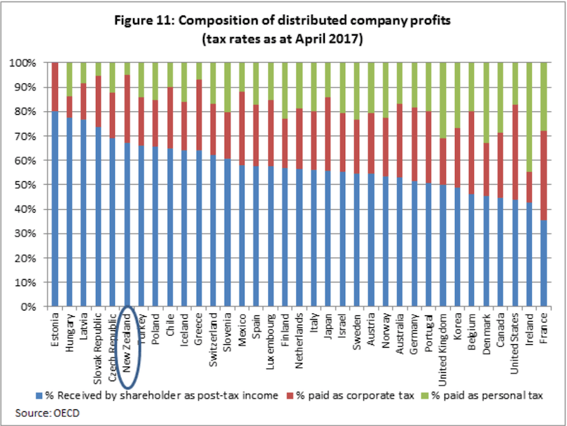 Aotearoa is one of the only countries in the OECD that doesn’t tax capital gains. We have no wealth tax either. We have the 12th-lowest top tax rate of the 38 countries in the OECD – Labour introduced a new top tax rate of 39% on incomes over $180,000 in 2021, which is lower than the 45% rate on incomes over £125,140 ($252,868 NZD) in the UK, and the 47% rate on incomes over $180,000 ($195,013 NZD) in Australia. Meanwhile, while our corporate tax rate of 28% is on paper one of the highest in the OECD, in terms of how much profit is actually taken home by shareholders, it is actually the sixth-lowest rate in the OECD.