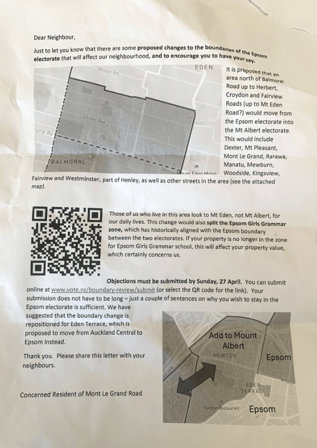 Some might see this as a repeat of 2014, when snobbery and “misinformation about school zones” got the blame for 700 people objecting to being moved out of Epsom and into the Mt Roskill electorate. Indeed, one submitter, Peter Thompson, pointed out that many of the people opposing the proposed adjustment relied on disinformation put out by someone he thought had a “vested interest in retaining the current boundary settings”. “Suggested solution,” his submission to the commission read. “Investigate and expose those responsible for trying to rort the democratic process. Disregard submissions premised on misleading information.”