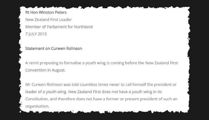 In 2013, the party tabled a complaint against Rolinson, and Peters ordered all NZ First social media pages to be shut down, including that of NZ First Youth. Snippets of a private Facebook chat conversation sent to David Farrar at the time have Rolinson claiming he was “saved” from disciplinary action by Peters, while being symbolically punished.