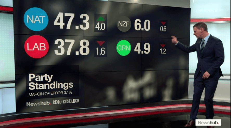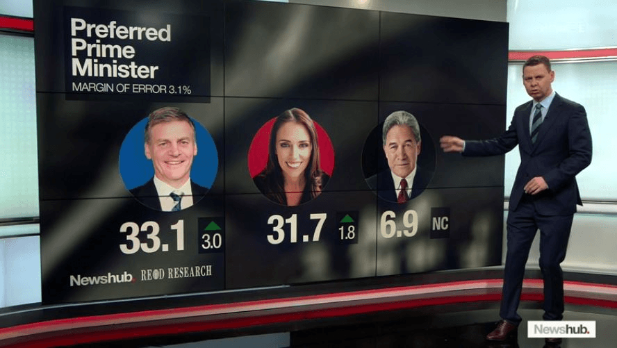 Hard to argue he’s exaggerating, however, given the numbers from tonight’s Newshub/Reid Research poll, revealed the day after advanced voting opened in New Zealand. “The Jacinda Ardern stardust has been blown away,” went the introduction. It showed “Bill English’s dramatic return to control”, said Gower.