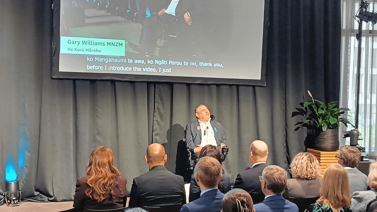 Gary Williams, a survivor with cerebral palsy, spoke on stage to cheers of “Go Gazza”. He introduced a video of the recently deceased survivor and activist Sir Robert Martin. Martin spoke about how hard he worked to build a life after leaving state care. “I didn’t know what a life was made up of,” he said. He asked the government to hold a citizenship ceremony for survivors who had been institutionalised and cut off from New Zealand society. As the video ended, he received a standing ovation.