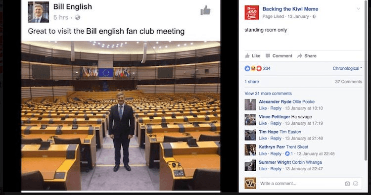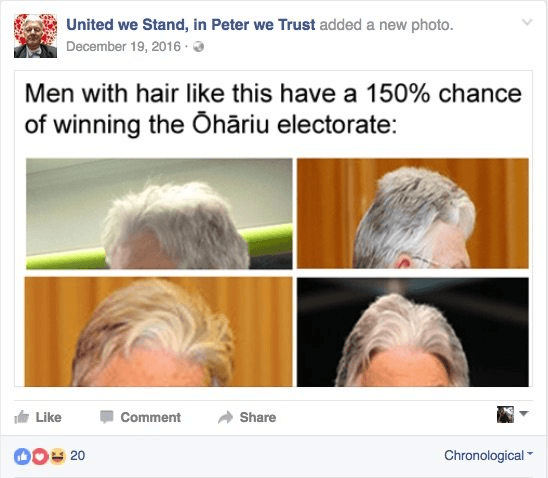Of course, there are also memes that represent other ends of the political spectrum. Facebook boasts National, Winston Peters, and Peter Dunne meme pages but they are thin in both content and audience, with likes only in the 50-100 range. To be honest, I’m surprised there are folks out there sufficiently passionate about Winston and Peter to follow their Facebook meme pages, let alone run them, so I’ll give them a pass.