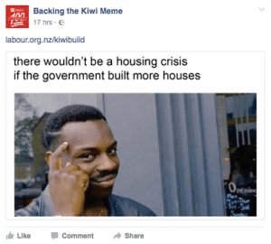 Backing the Kiwi Meme, with almost 2,300 likes at the time of writing, is a play on the Labour slogan “Backing the Kiwi Dream”. It focuses on combining current meme trends with pro-Labour, anti-Government themes. These memes can be clever, sometimes anti-Labour-establishment, and are always aiming to be topical.