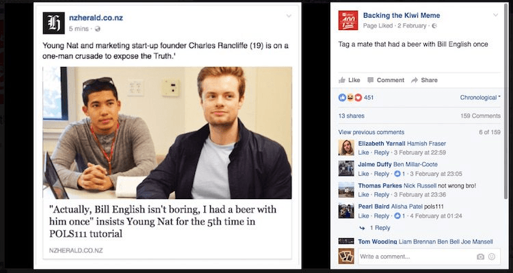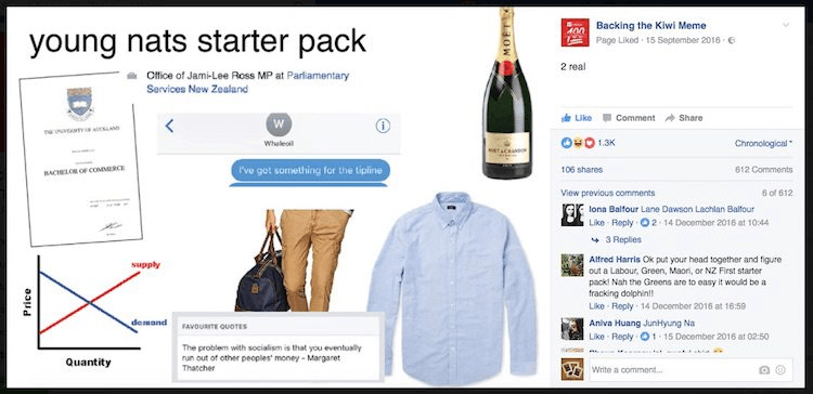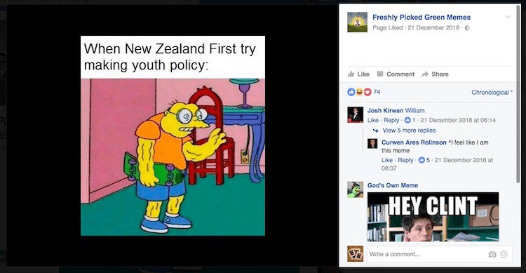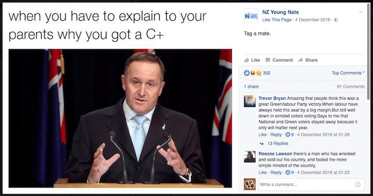There’s no popular National meme page, but there doesn’t need to be: the official NZ Young Nats page, a veritable overlord of young political Facebook pages with almost 21,500 likes, has been known to dabble in a meme or two itself. I suspect that any young go-getter considering going rogue with a side-Nat meme page risks attracting the ire of the powerhouse Young Nat brand.
