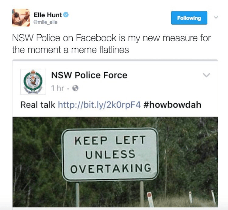What they allude to is the inherent anti-mainstream nature of the meme. While a good meme will proliferate far and wide, crossing between Twitter, Tumblr, Instagram, Facebook and Reddit, it also has a life cycle, a point at which, by common consent, it is no longer cool. Often this is when a group that represents those in power – corporations, political parties, the police – attempt to co-opt it. The result is usually incorrect and cringey.