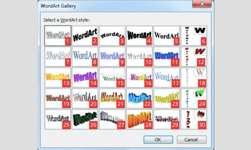 I utilised the top row of WordArt a lot because we didn’t have a colour printer at home and even when we eventually did, I was very far down the list of “people allowed to print in colour”. It’s amazing how much time you can spend perfecting the intensity of a curve when you haven’t got bright colours doing all the heavy lifting.