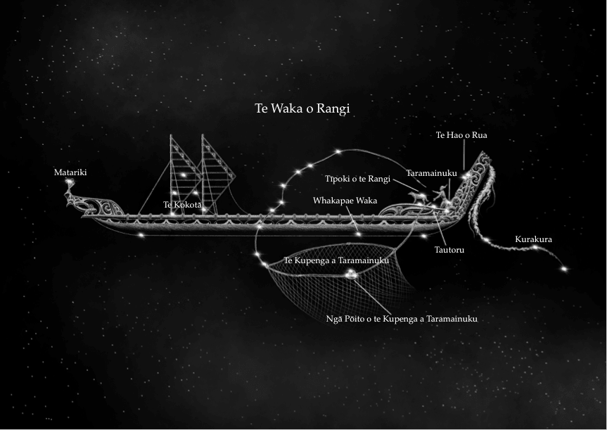 As Rangi says, Māori have many different views about what happens after death. One of those is that among the stars is Te Waka-o-Rangi, a canoe with Matariki at the front and Tautoru (Orion’s belt) at the back, captained by a star called Taramainuku.