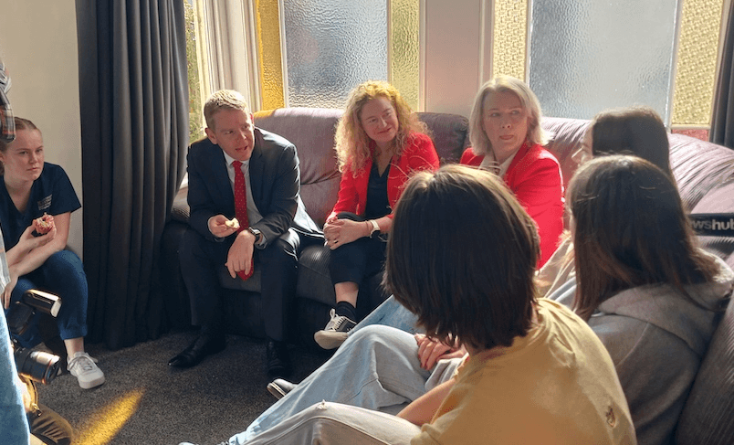 Today Chris Hipkins visited a student flat in Dunedin and brought two boxes of donuts with him. Tara Ward was there too.