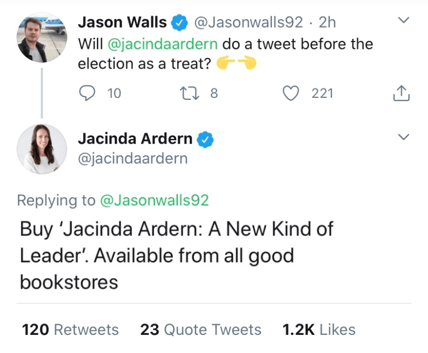 Perhaps to appease all those desperate for leaders to be on Twitter (I wouldn’t wish it on my worst enemy to be on Twitter), notoriously inactive Ardern took the bait from a press gallery journalist and tweeted for the first time since June. Can’t believe she used her one tweet to make a shout out but I endorse her support of local bookstores.