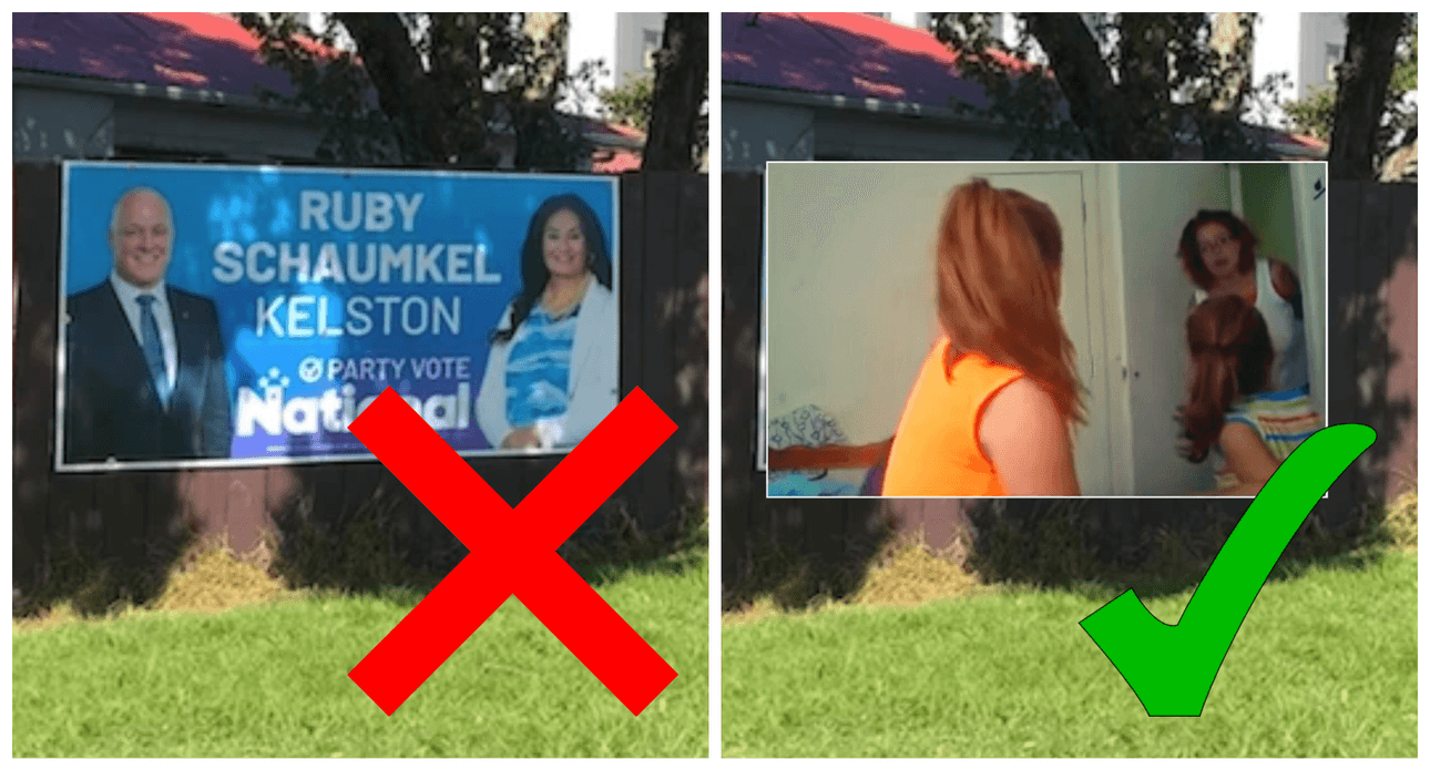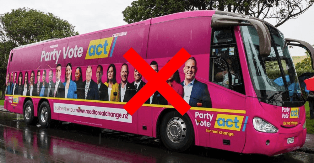 What’s more persuasive than a hoarding? A car with a politician’s face on it. They too must be kept covered and out of sight from midnight to 7pm on election day. Luckily MPs get paid way more than the average voter so they’ll probably have a garage in which to hide their giant face cars. If you see David Seymour driving his David Seymour car through the McDonald’s drive-thru at 1am on Saturday, call the police.