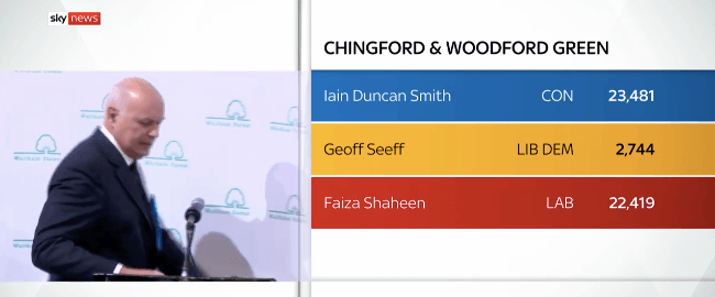 3.30pm: An incredible own-goal from the parties wanting to stop Brexit in this seat. Former Tory leader Iain Duncan Smith is one of the arch-Brexiteers of the Conservative Party, and between them, the other two candidates in the race could have knocked him off.