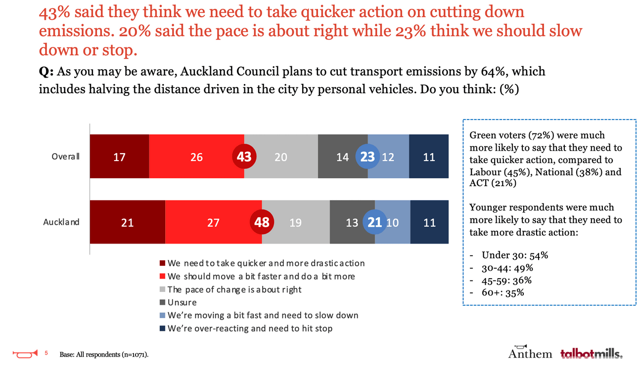 PR firm Anthem published late on Friday the results of a poll of over 1,000 New Zealanders by Talbot Mills in the week after the January 27 storms. The poll found just 43% of New Zealanders and 48% of Aucklanders wanted to take quicker and more drastic action to reduce emissions. It found 23% of those surveyed nationwide wanted to reduce or slow emissions reduction, with 21% of Aucklanders wanting less action.