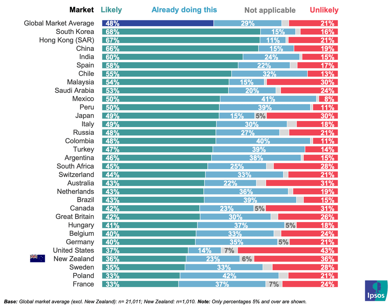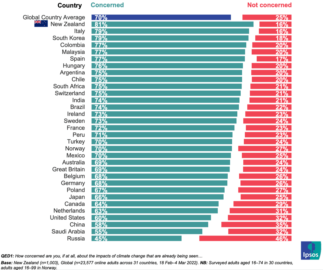 PR and communications firm Ipsos conducts a monthly “Global Advisor Survey” in 30 countries that looks at views on public issues including climate change. It surveys over 1,000 people in New Zealand and its most recent survey on climate change early last year found New Zealanders were: