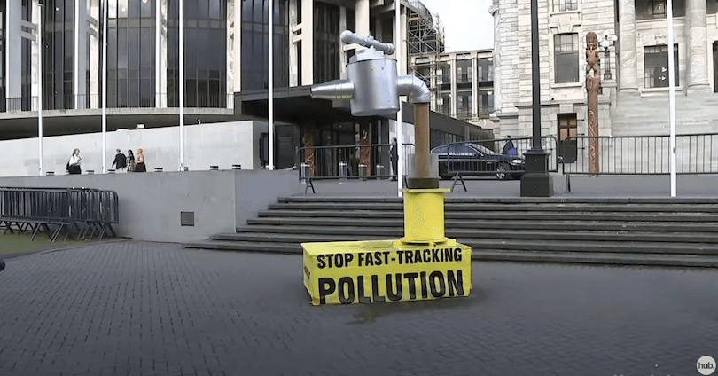 As the government pushed ahead on its plans for a fast-track consenting regime, Greenpeace planted a giant gushing vat of cow diarrhoea on parliament’s forecourt. With the manure burbling away behind her, its spokesperson Gen Toop told Newshub the backdrop was a taste of what’s about to come for the whole country. “We’ve brought the pollution problem here to parliament because they’re about to make it worse with this fast-track consenting bill,” she said.