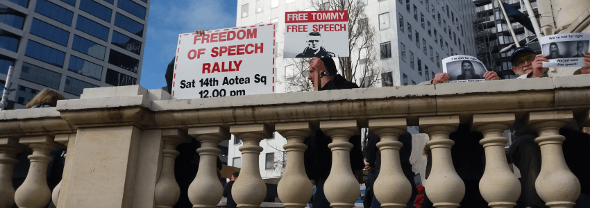 It wasn’t actually the largest demonstration at Auckland’s Aotea Square on Saturday. That honour went to Falun Gong, who demonstrate regularly against the Chinese government. But it was certainly the most contentious. And while the protest was billed as a free speech event, the majority of the signs being held were about a British alt-right figure called Tommy Robinson, currently in prison after being convicted of contempt of court charges – charges that some of his supporters believe are politically motivated. Many of the speeches veered sharply away from free speech issues, to focus instead on warning against Sharia law, which the speakers said was taking hold in Britain.
