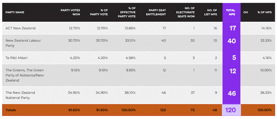 Let's now add the winners of the marginal seats to the existing National electorate MPs, who we'll presume all hold their seats given the swing to the Nats.
